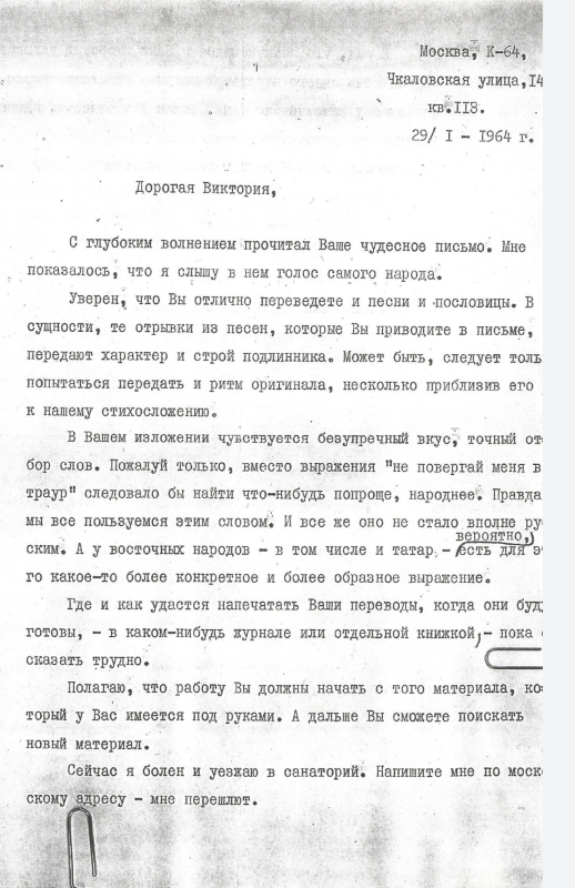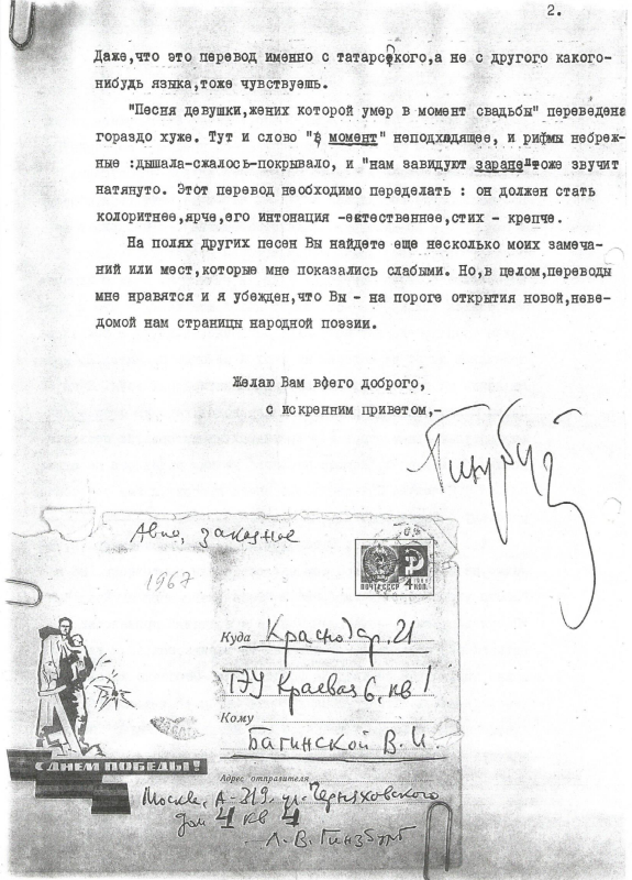 Виктория Ильинична последовала совету. Ответ от именитого советского переводчика и публициста не заставил себя долго ждать. 20 мая 1967 года она получила письмо от Л. В. Гинзбурга письмо, где он даёт свою оценку её труда. Переводы ему нравятся, и он высказывает убеждение, что Виктория Ильинична стоит «на пороге открытия новой, не ведомой нам страницы народной поэзии» (см. документ № 3).