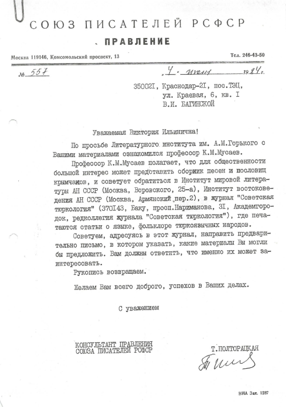 Однако об издании сборника речь, по-прежнему, не велась. Виктория Ильинична решает отправить свои материалы в Правление Союза писателей РСФСР, откуда в апреле 1984 г. приходит ответ, в котором её уведомляют, что материалы переданы в Литературный институт им. М. Горького с просьбой помочь. В июне 1984 г. приходит ответ от профессора Литературного института им. М. Горького К.М. Мусаева. Он полагает, что сборник песен и пословиц крымчаков может представлять интерес для общественности и даёт перечень тех институтов и журналов, которые могут заинтересоваться её работой: «Институт мировой литературы АН СССР», «Институт востоковедения АН СССР», журнал «Советская тюркология» (см. документ № 9).