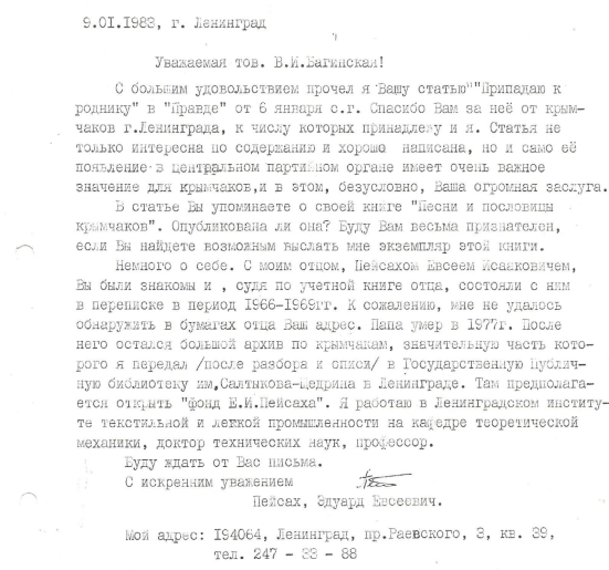Наконец, в центральной газете страны, в «Правде», 06.01.1983 г. вышла статья настойчивой, целеустремленной и сильной духом крымчачки «Припадаю к роднику», в которой было открыто заявлено о проблеме крымчакского фольклора и об угрозе исчезновения самих крымчаков. Статья получила много отзывов из различных тогда ещё советских республик. «С большим удовольствием прочел Вашу статью…Спасибо Вам за неё от крымчаков Ленинграда» - один из многочисленных откликов крымчаков, в данном случае «крымчаков Ленинграда» в лице Э.Е. Пейсаха (письмо от 09.01.1983 г.; см. документ № 8).