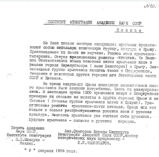 Профессор Института Этнографии АН СССР, доктор исторических наук И.И. Чебоксаров, один из тех, кто ответил на многочисленные запросы нашей героини, когда-то предрек: «Молодежь крымчаков уже считает себя русскими. Будущее крымчаков – слияние с русским народом» (см. документ № 10).