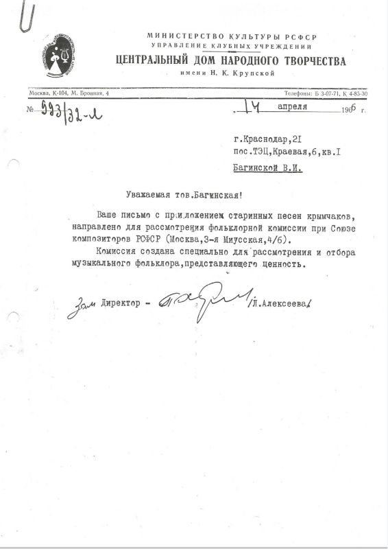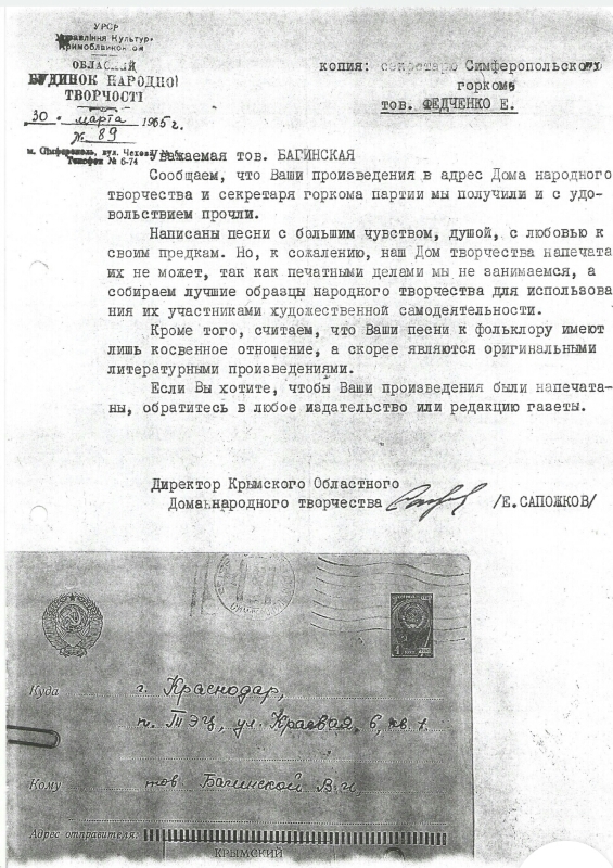 14.04.1966 г. пришел ответ из Центрального дома народного творчества, в котором сообщалось, что письмо Виктории Ильиничны с приложением старинных песен крымчаков направлено на рассмотрение в фольклорную комиссию при Союзе композиторов РСФСР. Фольклорная комиссия тоже очень заинтересовалась, просила поддерживать постоянную связь, а также прислать магнитофонные записи, которых у Виктории Ильиничны, к сожалению, тогда не было (см. документ № 4).
