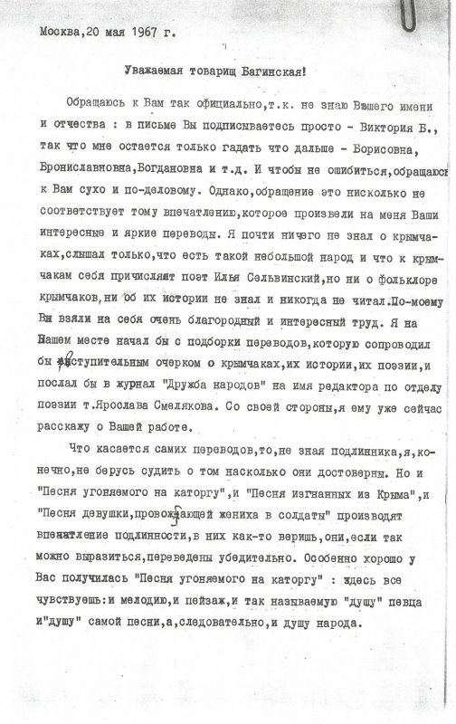 В 1965 году Виктория Ильинична направила свои переводы в адрес Крымского Дома Народного творчества, откуда 30 марта того же года получила ответ следующего содержания: «Уважаемая товарищ Багинская, сообщаем, что Ваши произведения мы получили и с удовольствием прочли…» Далее следовал вежливый отказ и участливый совет обратиться в любое издательство или редакцию газеты (см. документ № 2).
