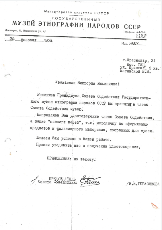 Февраль 1968 г. – Музей этнографии народов СССР «желает успехов» в её работе, июль 1969 г. – «Комсомольская правда» «благодарит за внимание», желает удачи.