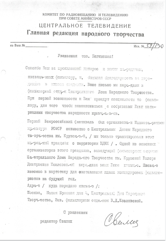 Виктория Ильинична послала материалы в Главную редакцию народного творчества Центрального телевидения. Откуда её поблагодарили за проявленный интерес к передачам, посвященным фольклору, и сообщили, что её письмо передано в фольклорный отдел Центрального дома народного творчества, где пообещали прислать специалистов по фольклору для ознакомления с собранным материалом творчества крымчаков (см. документ № 6).