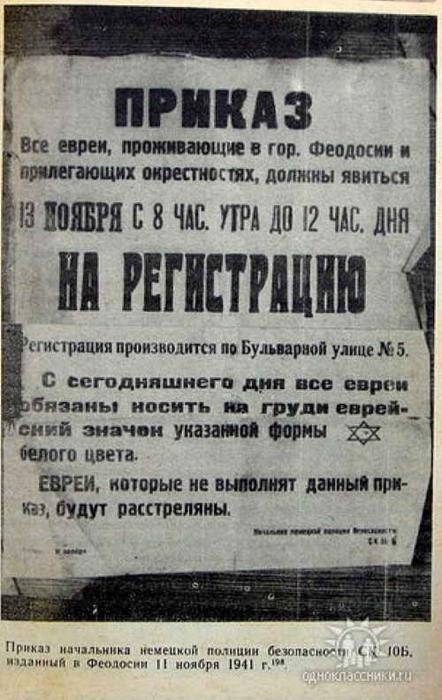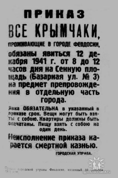 В конце ноября – начале декабря 1941 года в городах Крыма: Джанкое, Евпатории, Керчи, Симферополе, Феодосии, Ялте были развешаны приказы о том, что евреи и крымчаки должны прийти на сборные пункты. Тексты их были почти идентичны: все евреи (крымчаки), проживающие в том или ином городе или его окрестностях, обязаны явиться в указанный день и час на предмет препровождения в отдельную часть города. В данный приказом срок явка обязательна. Вещи могут быть взяты с собой. Квартиры должны быть опечатаны. Пищу можно взять с собой на один-два дня. Вещи в полной сохранности должны быть оставлены в квартире. Эти приказы оканчивались одинаковой фразой: «неповиновение карается смертной казнью».