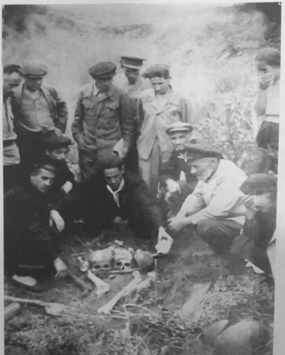 На фото: 6 августа 1946 г., после богослужения в синагоге, группа евреев и крымчаков на трёх автомашинах поехала на место расстрела, на 10 км Феодосийского шоссе Симферополя, провели там  панихиду и раскопки, на этом мероприятии присутствовал раввин Пинский.