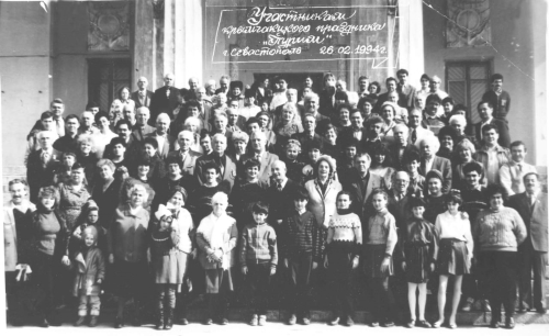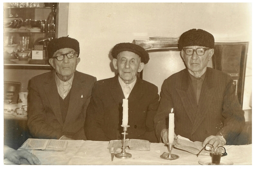 На фото: Борис Исаакович Томалак, Михаил (Моше-акай) Маркович Гурджи, Абрам Моисеевич Пейсах. Молитва на тъкуне Кале Яковлевны Гурджи (Пейсах). Симферополь, 1983 г.