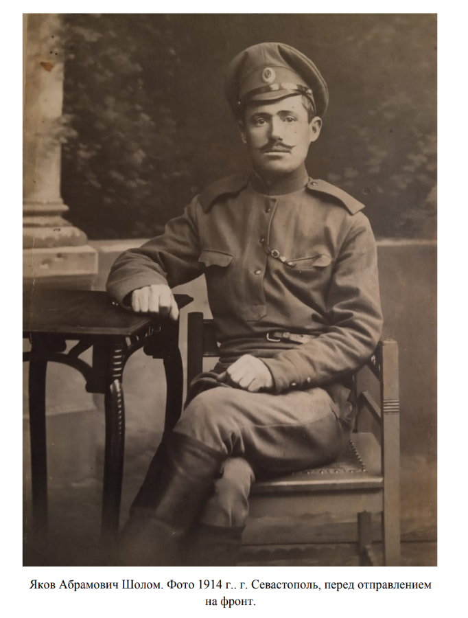 В 1914 году, большая и дружная семья Шолом, состоявшая из отца – Абрама Исааковича Шолома, его жены Эсфирь, пяти сыновей и одной дочери, проводили младшего сына Якова на фронт.