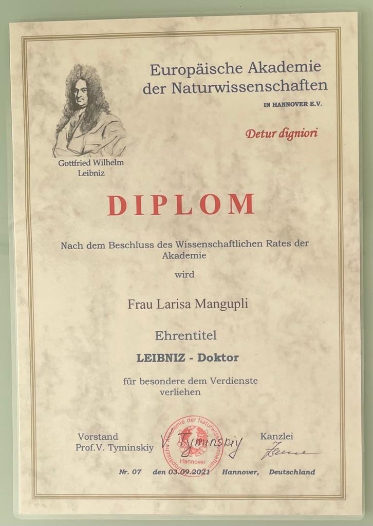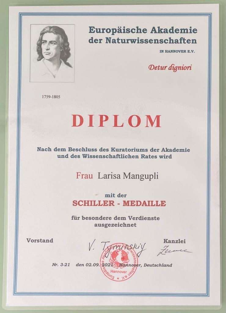 А недавно Президиум Европейской академии естественных наук присвоил Ларисе Мангупли звание «Почётный доктор журналистики» и наградил её медалью имени Шиллера «за выдающиеся личные качества и профессиональные заслуги».